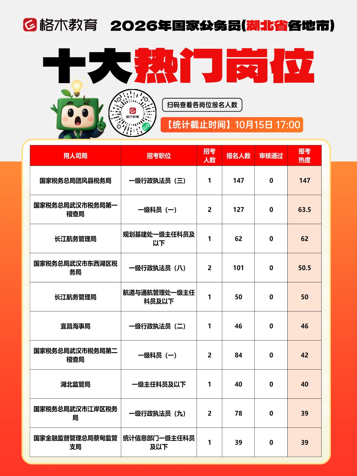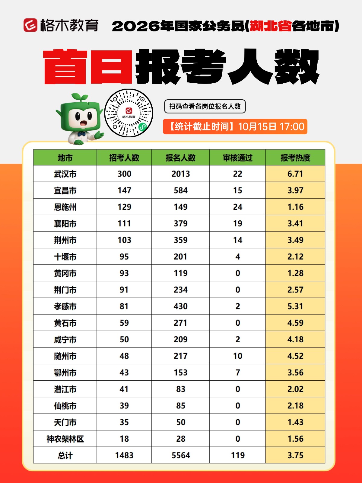 2026年国考首日报名人数统计:截至10月15日17时,湖北招录1483人,报名人数5564人,审核通过119人。